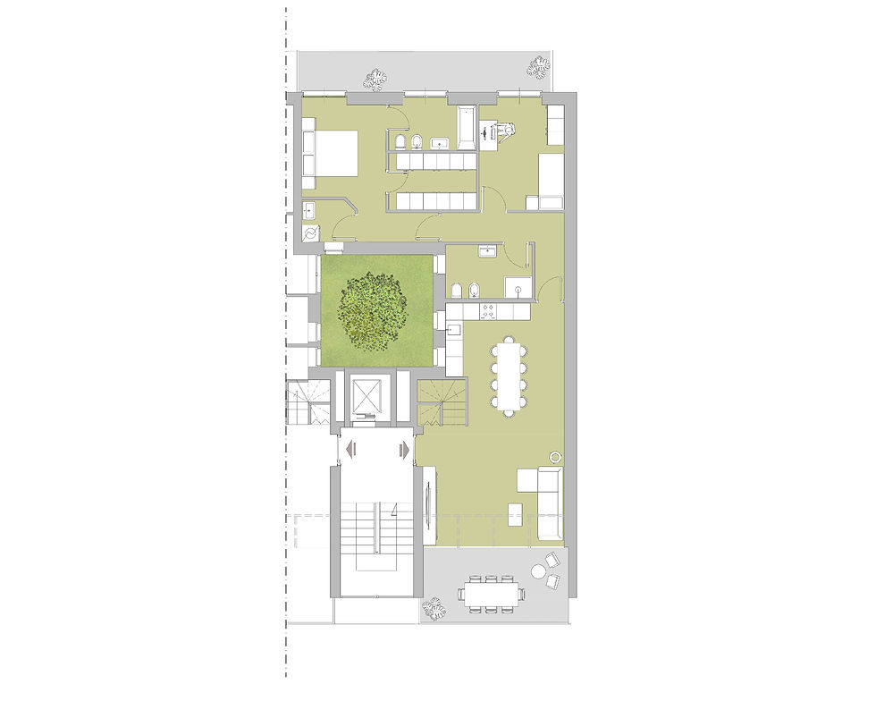 Il duplex 5Cb è collocato al quinto e sesto piano nella scala C, ed è composto da ingresso su soggiorno living, cucina, 2 camere da letto di cui una con bagno e, cabina armadio dedicate, 1 bagni, ripostiglio, un terrazzo sul lato strada e un balcone interno cortile al quinto piano. Il sesto piano è composto da un terrazzo molto ampio, una serra e un ripostiglio.